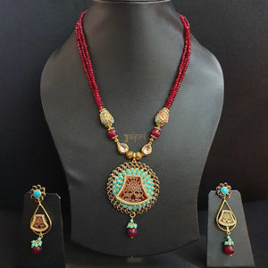 Red Beads Stone Floral Fusion Pendant With Earrings
