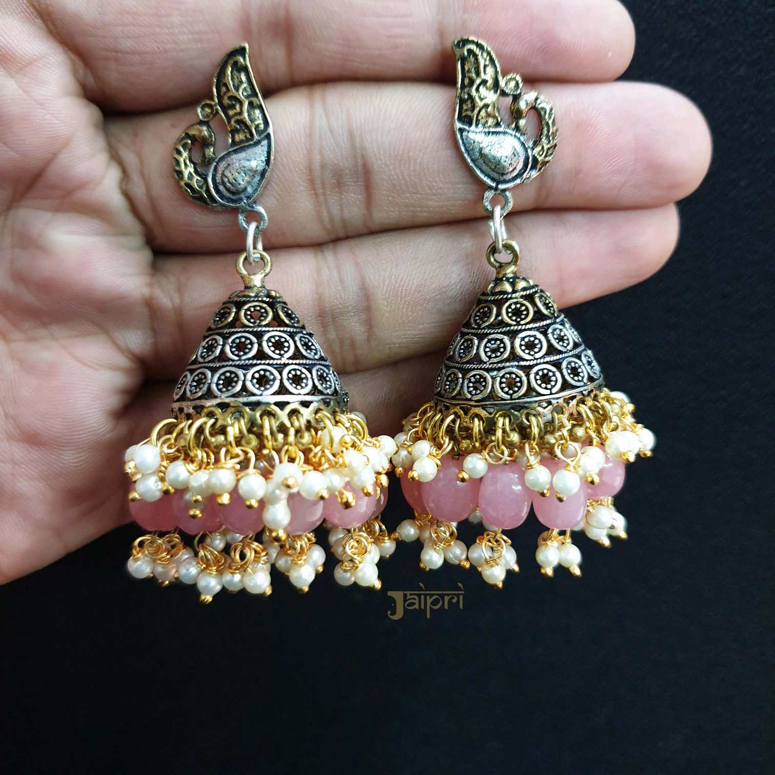 Pink Peacock Dual Tone Oxidised Silver Jhumki Earrings