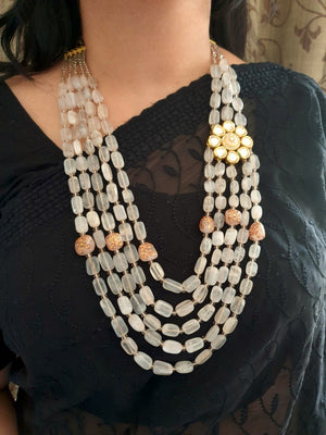 Elevate your style with this exquisite baby pink stone beaded necklace set. Its intricate craftsmanship and regal charm make it the perfect statement piece