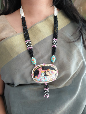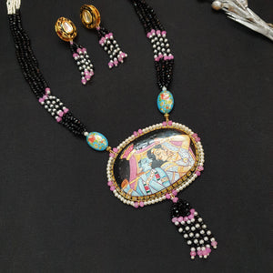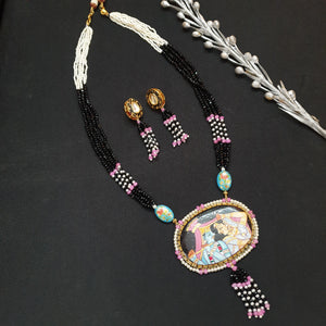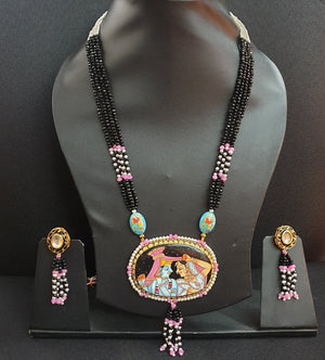 Black Beaded Handpainted Radha Krishna Set With Earrings