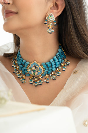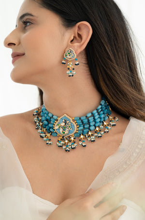 Make every occasion unforgettable with this handcrafted blue beaded choker necklace set, complete with matching earrings. The intricate Kundan detailing, pearl accents, and rich emerald tones create a regal charm, while the multi-strand beadwork ensures a bold yet graceful look. Whether for a wedding, engagement, or festive gathering, this jewelry set promises to be the highlight of your ensemble.