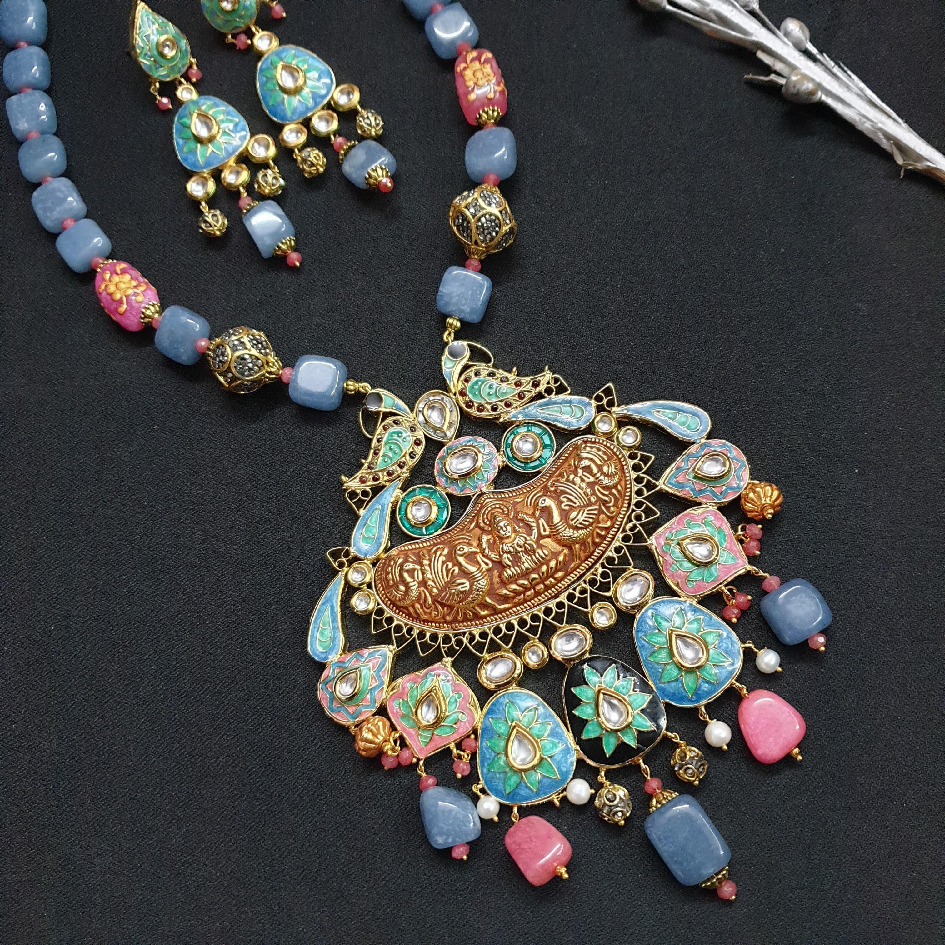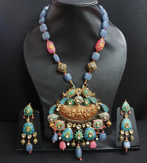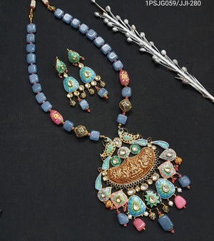 Blue Stone Fusion Meenakari Pendant Set With Earrings