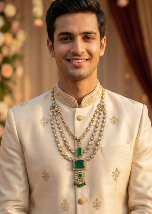 Styling: These are the perfect accessories to accentuate the elegance of your traditional outfit, adding a perfect pop of colour and edginess. The beautiful elements of the necklace go well with the sherwani or narrow jacket. A statement groom necklace is enough to make the entire outfit look amazing. It looks better with a solid colour outfit or a pastel outfit.
