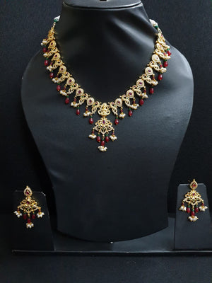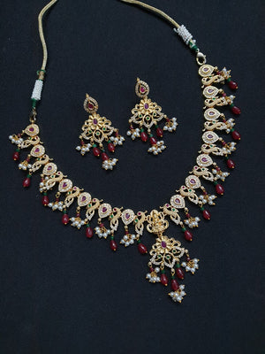 Expertly crafted in a gold finish, this statement necklace features a divine Lakshmi pendant, intricate temple detailing, and a rich combination of deep ruby-toned beads and elegant pearl drops. The matching earrings complete the look, making it an ideal choice for South Indian bridal wear and wedding ceremonies.