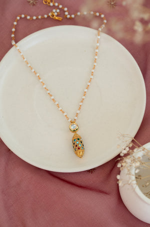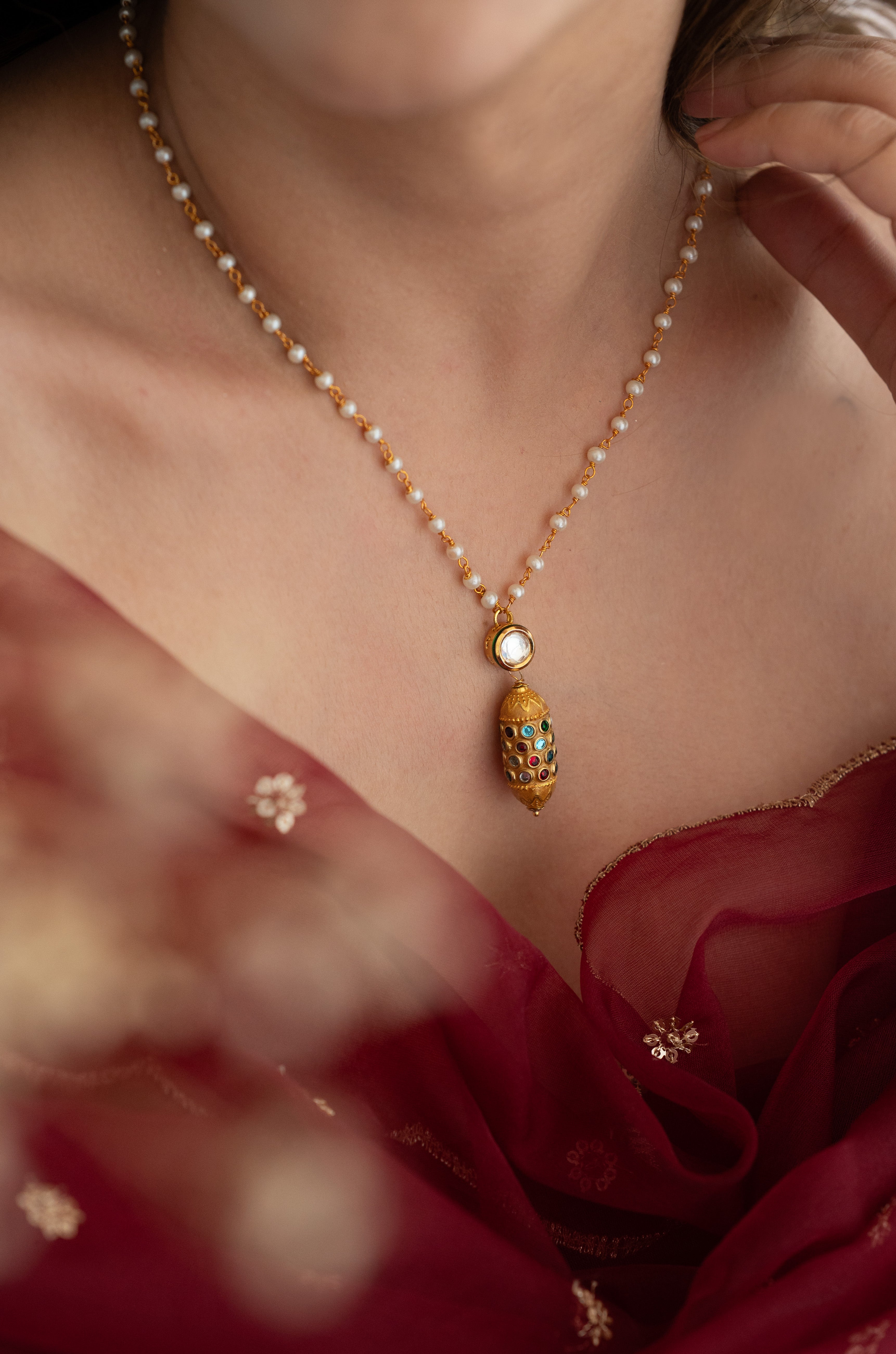 Celebrate tradition with elegance in this handcrafted festive kundan pendant necklace. Featuring a kundan motif with pearl and multi accents, a bold kundan pendant with crystal detailing, and a pearl-beaded chain interlinked with pearl & multi beads, this necklace is a true work of art.