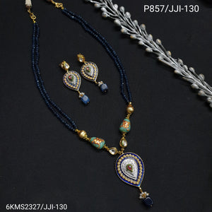 Dark Blue Beaded Meenakari Pendant Set With Earrings