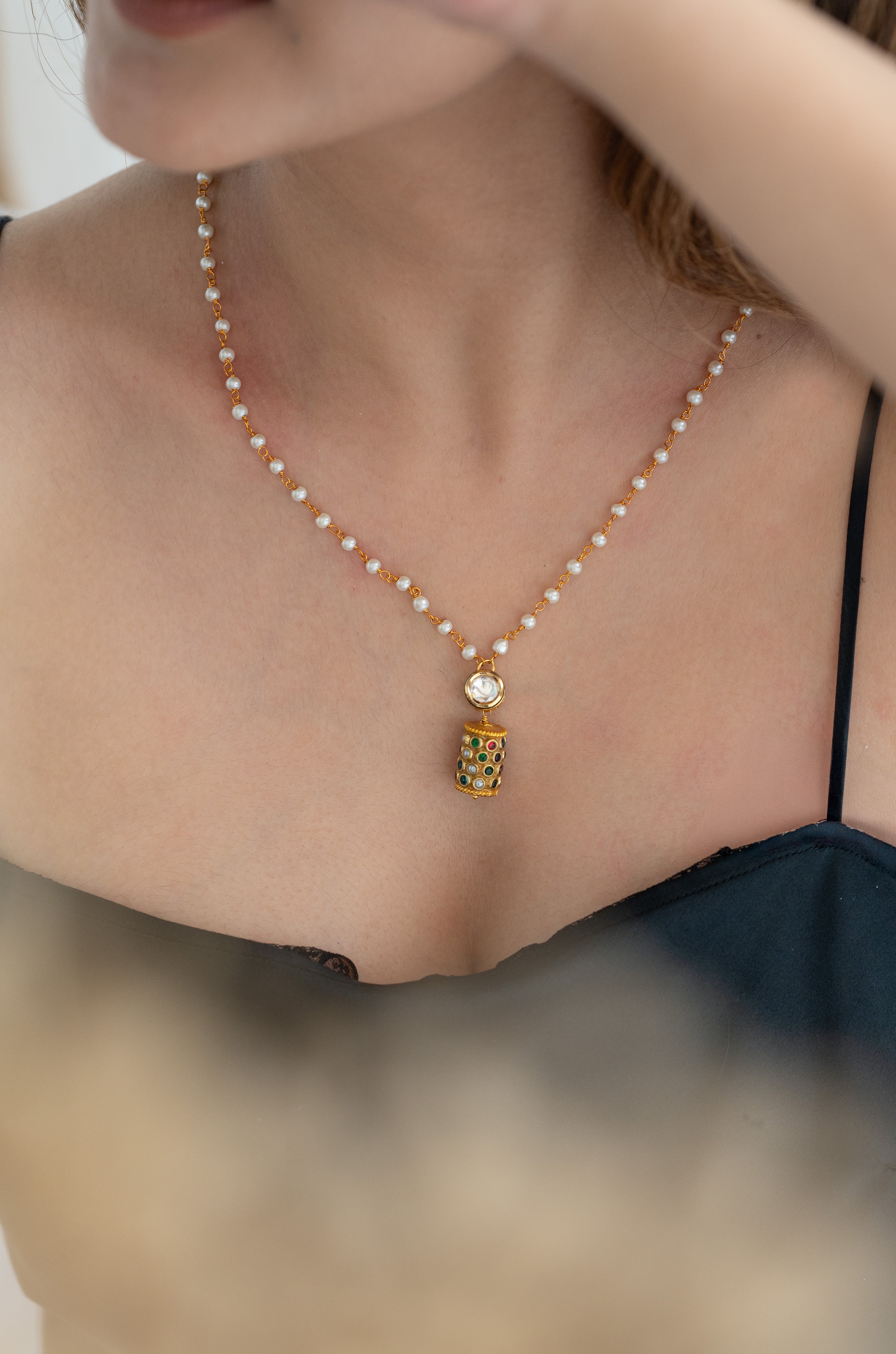 Celebrate tradition with elegance in this handcrafted festive kundan pendant necklace. Featuring a kundan motif with pearl and multi accents, a bold kundan pendant with crystal detailing, and a pearl-beaded chain interlinked with pearl & multi beads, this necklace is a true work of art.