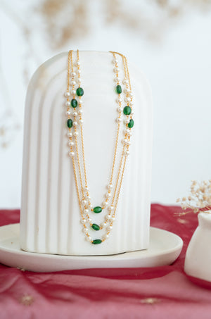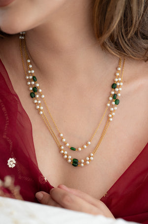 Delicate Pearl and Green Beaded Chain Necklace Set