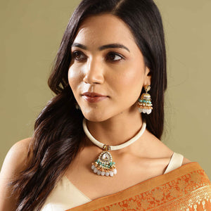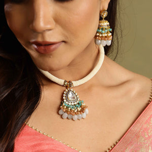 Designer Green Beads Stone Kundan Pendant With Jhumki Earrings