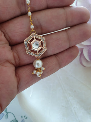 An elegant Kundan polki design pearl beaded maang tikka the most stunning festoon. The perfect accessory for your occasion. This maang tikka is handcrafted with love
