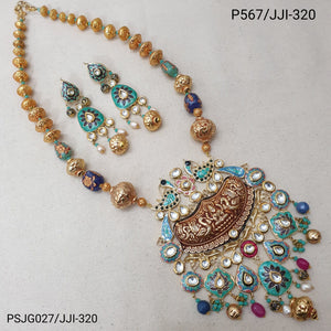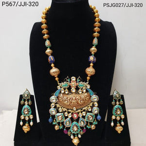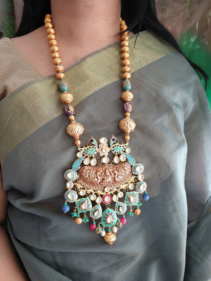 Designer Temple Pendant Set With Geru Beads and Earrings