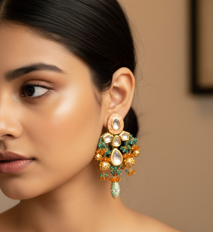 Styling: These are the perfect accessories to accentuate the elegance of your traditional outfit, furthermore, adding a perfect pop of color and edginess. The beautiful elements of the earrings go well with the saree or any western dress. A statement earrings is enough to turn the entire outfit look amazing. It looks better with a solid color outfit or pastel outfit.