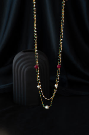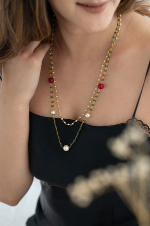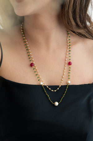 An elegant, stone beaded pearl necklace with the most stunning festoon. The perfect accessory for your occasion. This necklace is handcrafted with love