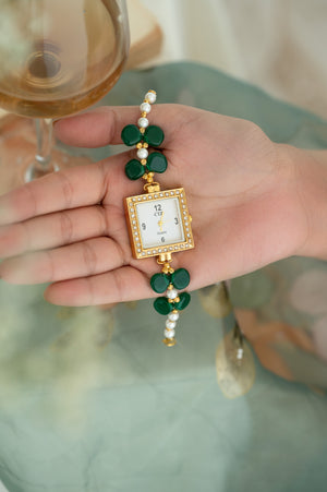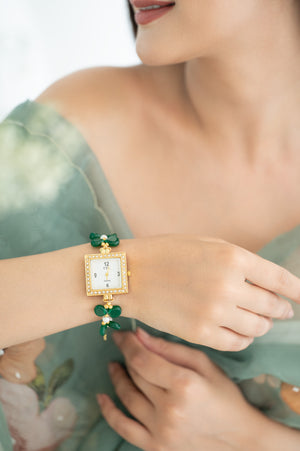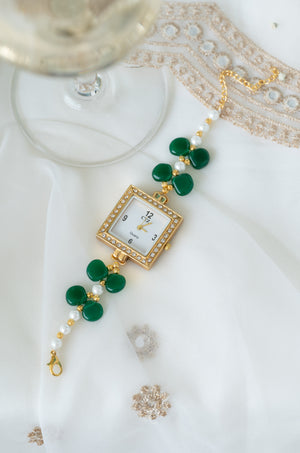 Step into timeless sophistication with this handcrafted beaded quartz watch bracelet. Designed with a gold-plated square dial encrusted with sparkling crystals, paired with green gemstone beads and pearl accents, this unique accessory beautifully merges the charm of jewelry with the functionality of a watch.