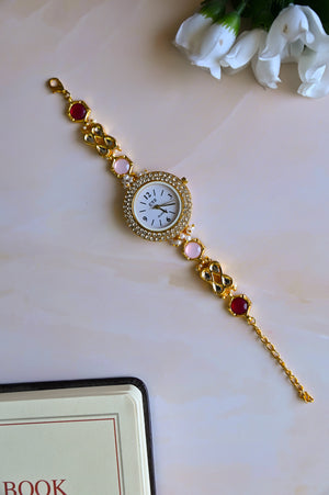 Enhance your look with our Elegant Kundan Stone Wrist Watch. This stunning timepiece features traditional Kundan craftsmanship, adding a touch of sophistication to any outfit