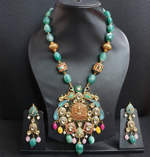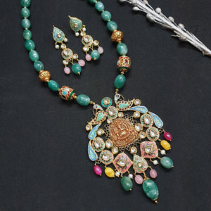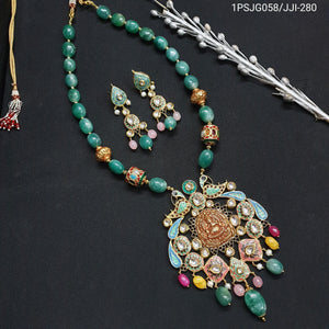 Emerald Green Stone Fusion Meenakari Pendant Set With Earrings