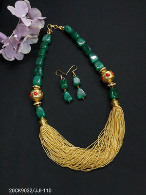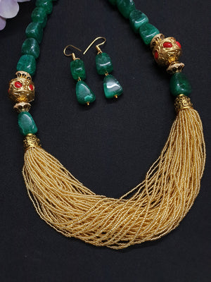 Emerald Green Stone Golden Seed Bead Necklace Set
