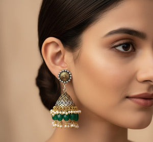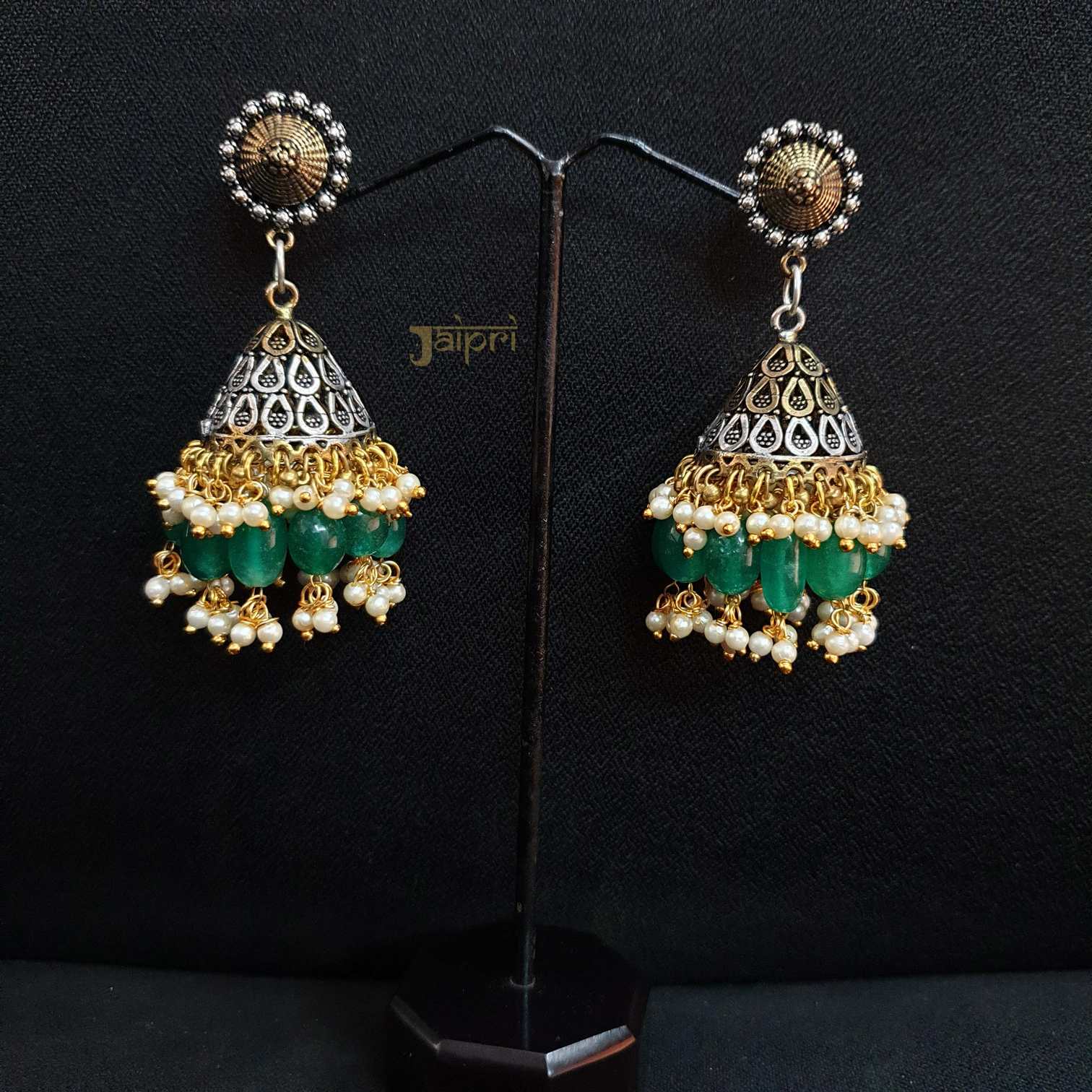 Green Stone Dual Tone Oxidised Jhumki Earrings