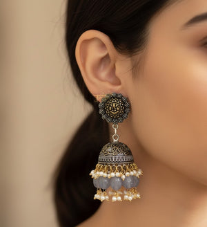 An elegant Dual tone Grey Stone Jhumki earrings with the most stunning festoon. The perfect accessory for your occasion. This earrings are handcrafted with love