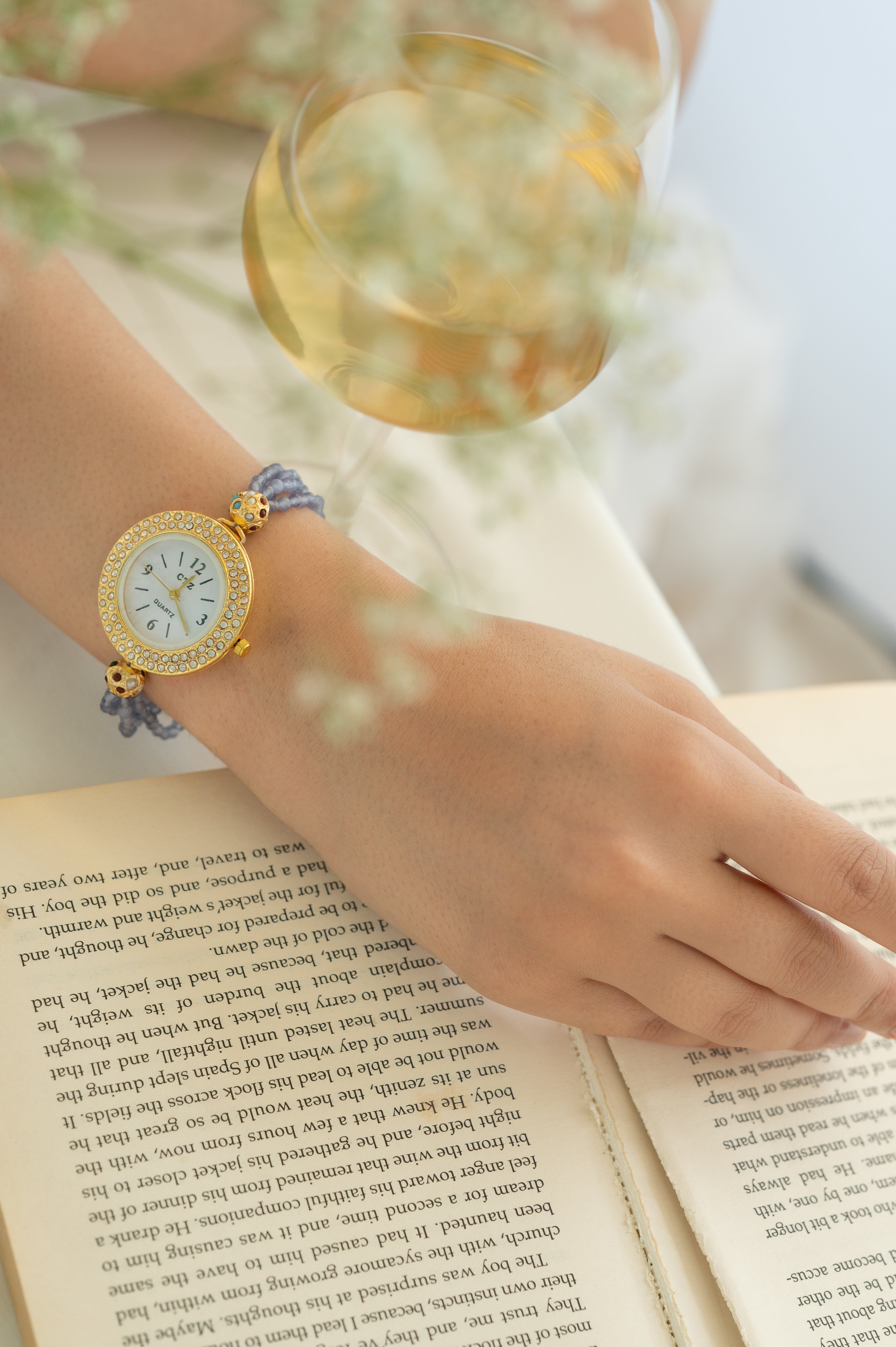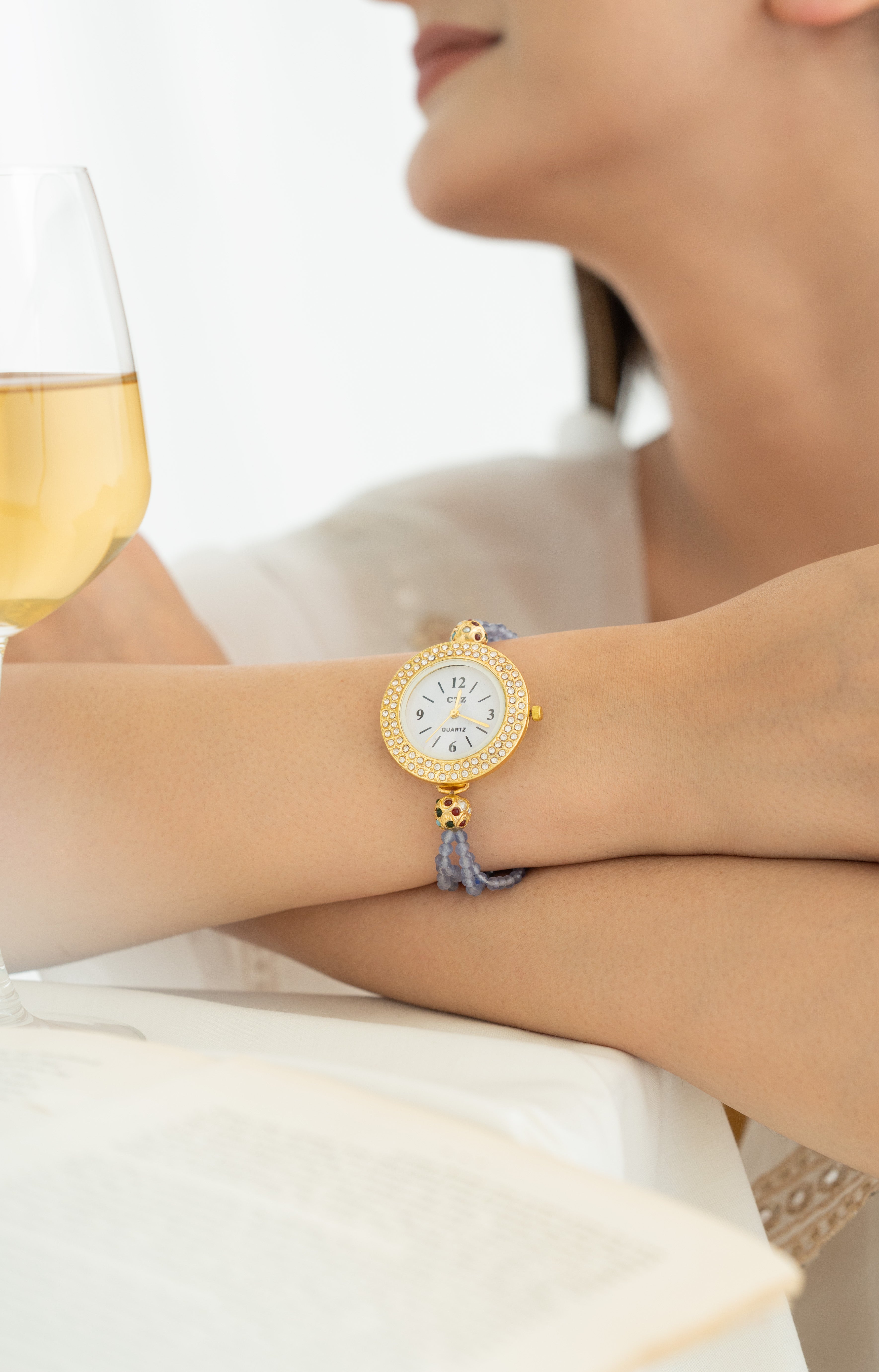 Gold Plated Designer Stone Dial Beaded Wrist Watch