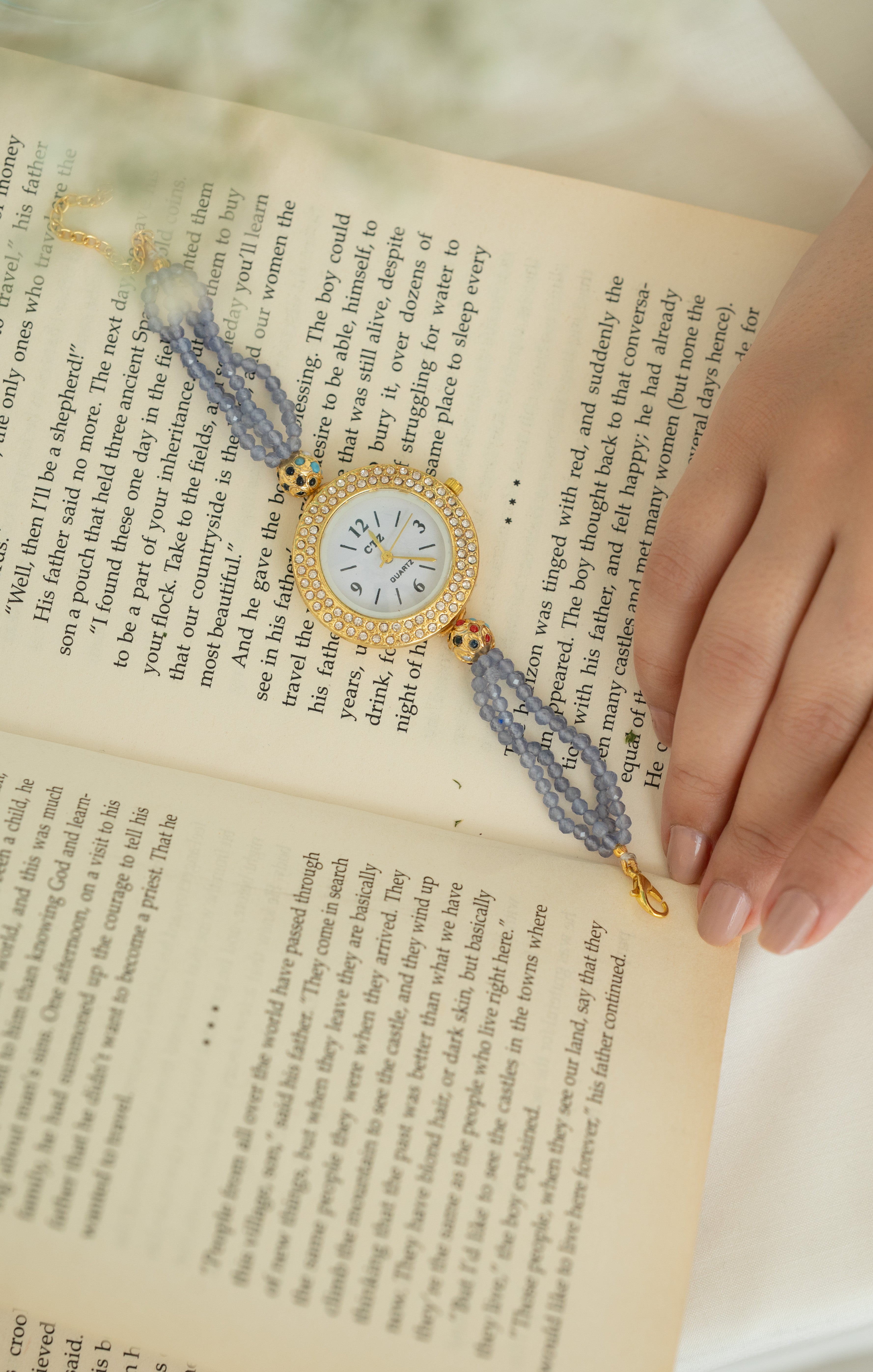 Elevate your style with this elegant gold-plated wrist watch featuring a stone-studded dial and dual-strand beaded bracelet. Perfect for weddings, parties, or daily glam, this watch blends functionality with timeless beauty.