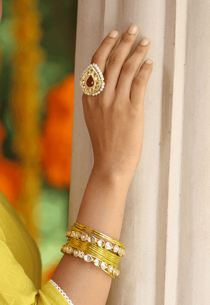 Adorn yourself with a truly exquisite piece of jewelry. Our Kundan bangles feature an opulent handcuff and ring, set in luxurious gold and decorated with luminous crystals for a touch of sparkle. An ideal finishing touch for any chic ensemble.