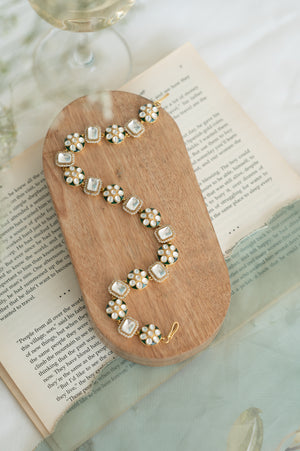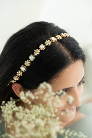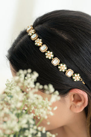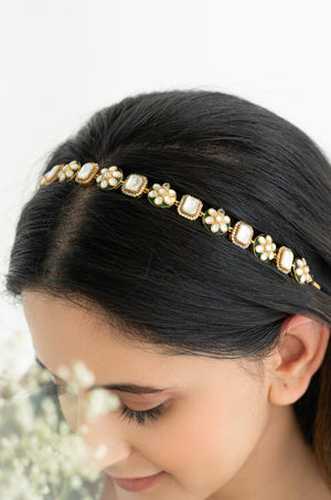 This handcrafted hairband combines intricate Kundan artistry with rich green enamel and clusters of lustrous pearls, creating a timeless and versatile hair accessory. Perfect for brides, bridesmaids, or festive occasions, it adds a regal finishing touch to any outfit. Its lightweight, comfortable fit ensures you can shine all day without compromise.