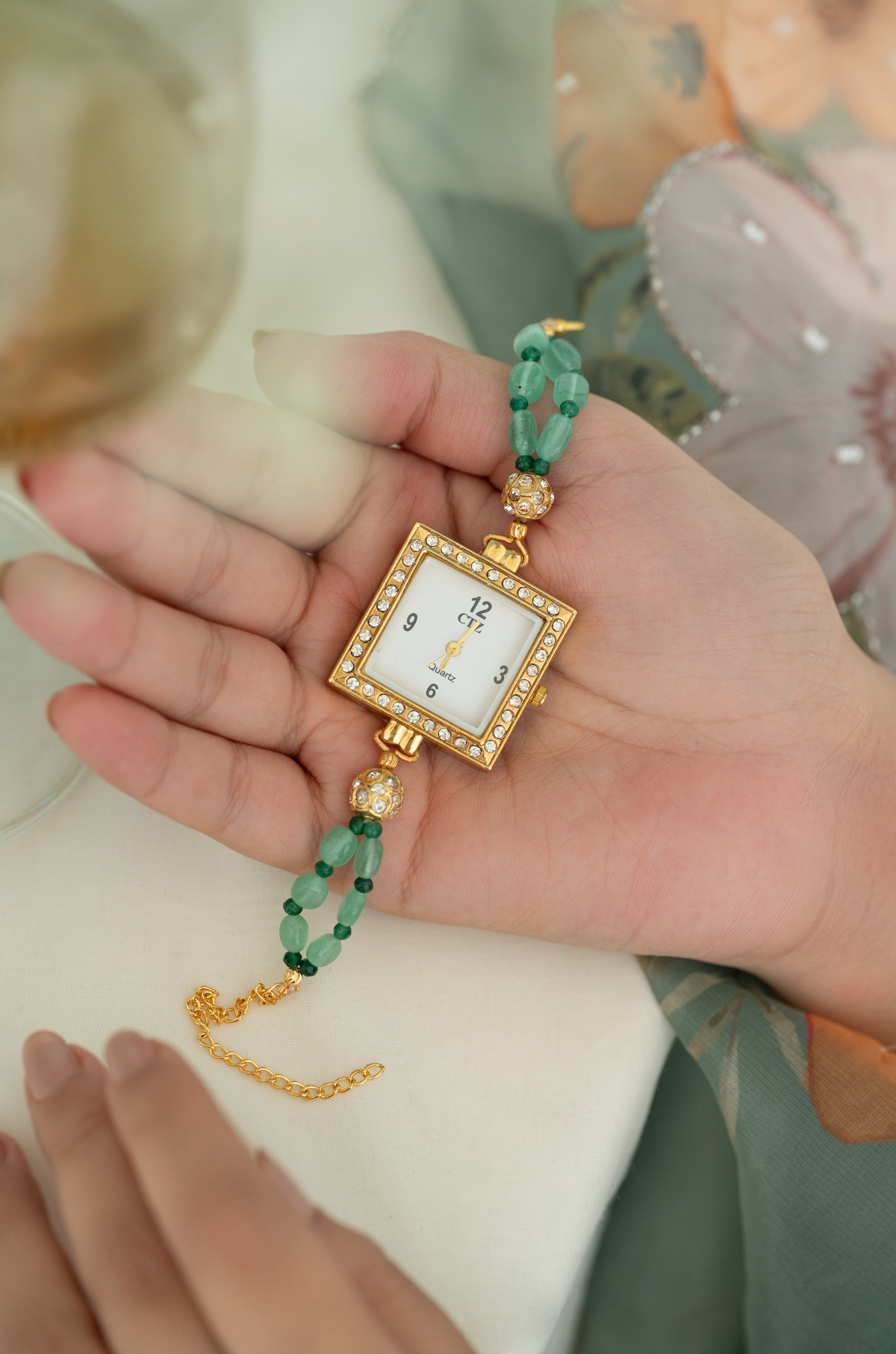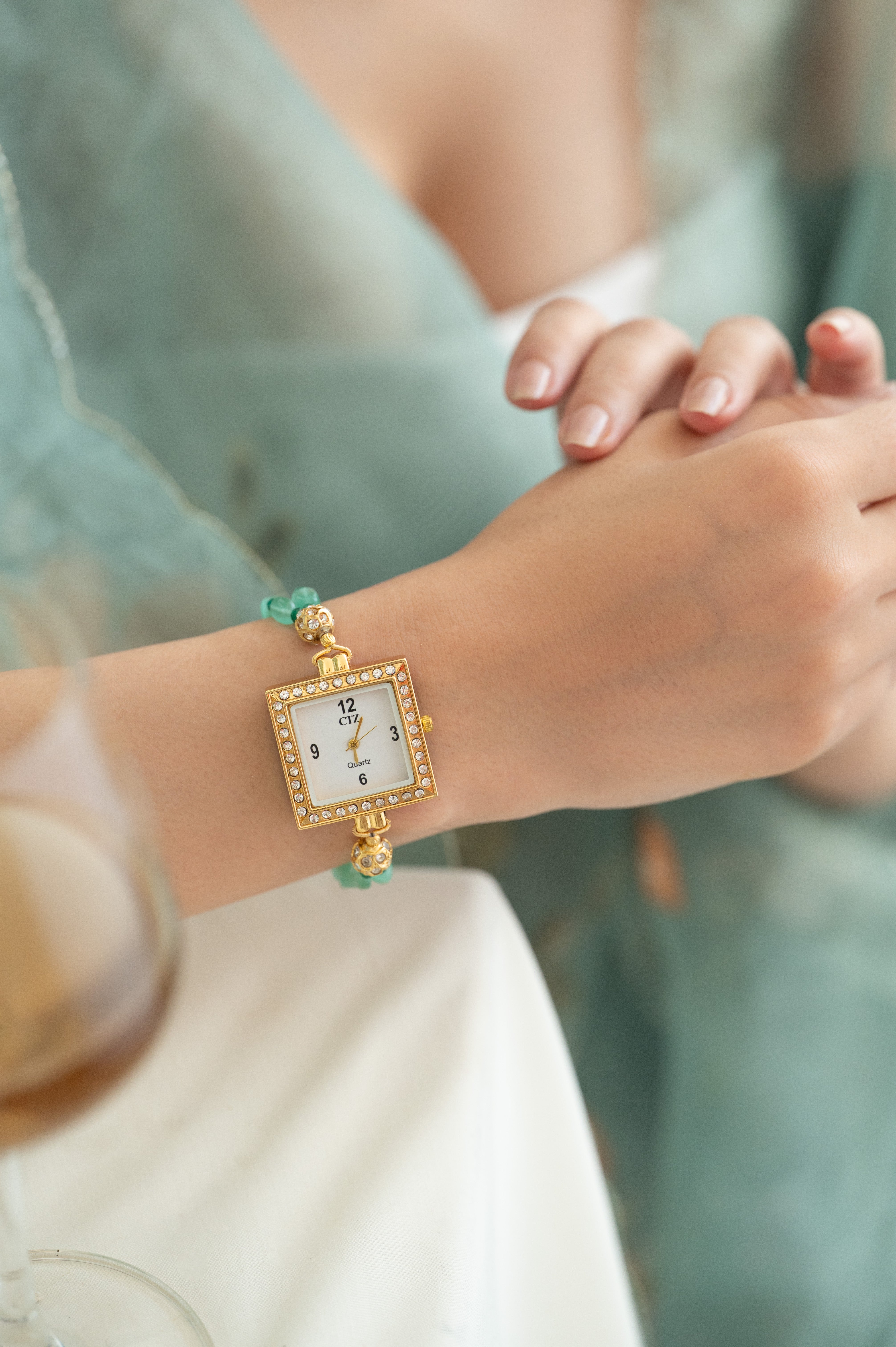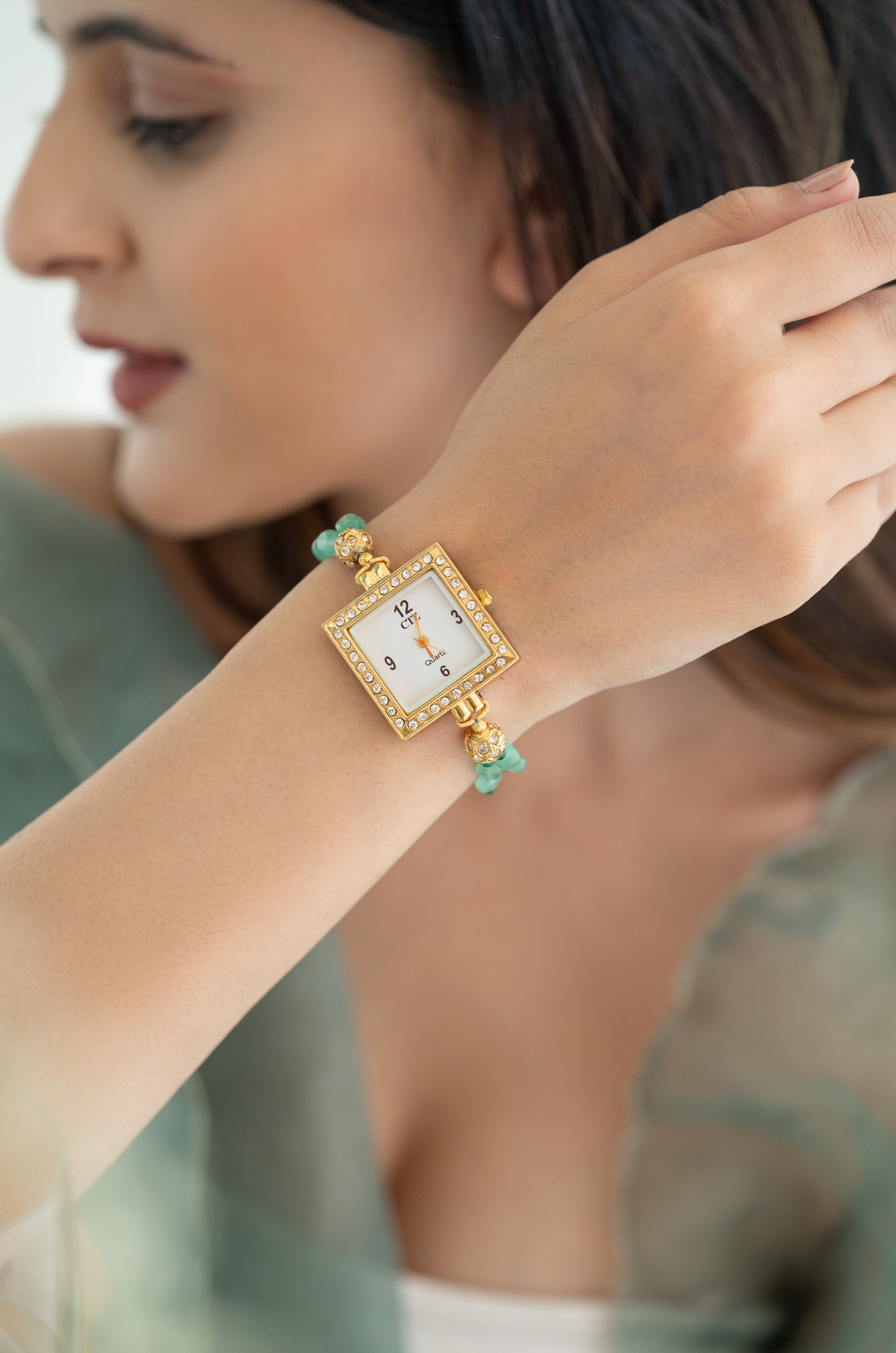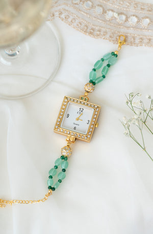 Add timeless elegance to your look with this gold-plated square dial bracelet watch, beautifully designed with sparkling crystals and vibrant green beads.