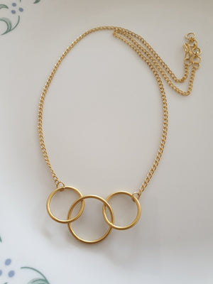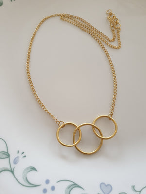Three-Linked Circle Necklace. This beautiful and simple Three Linked Circle Necklace features a handmade link made of Three graduated circles from small, to large in the middle, back out to small on a gold finished chain with a lobster clasp closure.