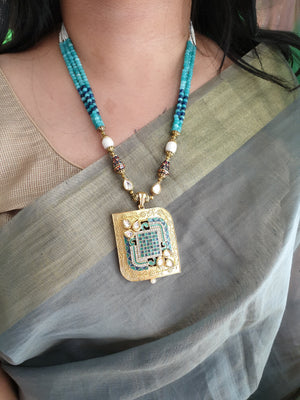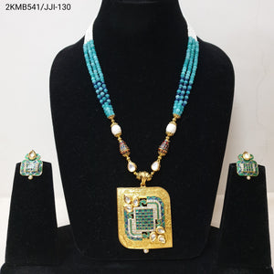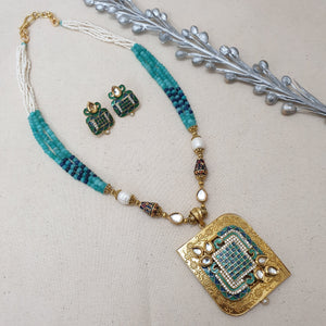 Gold Tone Kundan Blue Beaded Pendant Set With Earrings
