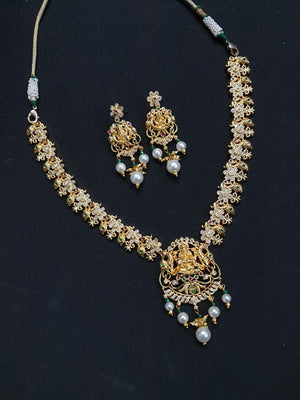 Expertly crafted in a gold finish, this statement necklace features a divine Lakshmi pendant, intricate temple detailing, and a rich combination of elegant pearl beads. The matching earrings complete the look, making it an ideal choice for South Indian bridal wear and wedding ceremonies.