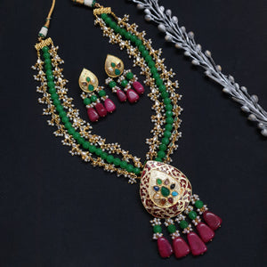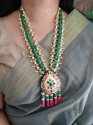 An elegant green beads stone meenakari pendant with the most stunning festoon. The perfect accessory for your occasion. This necklace is handcrafted with love