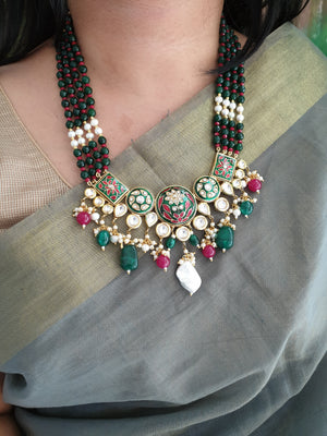 An elegant green beads stone meenakari pendant with the most stunning festoon. The perfect accessory for your occasion. This necklace is handcrafted with love