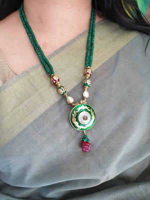 An elegant green beads stone meenakari pendant with the most stunning festoon. The perfect accessory for your occasion. This necklace is handcrafted with love