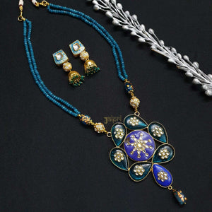 Green & Blue Beads Stone Fusion Pendant With Earrings