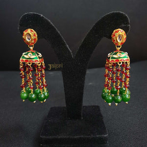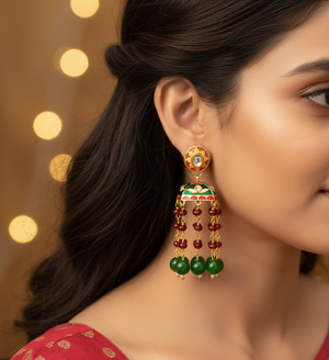 An elegant green stone meenakari earrings with the most stunning festoon. The perfect accessory for your occasion. This earrings is handcrafted with love