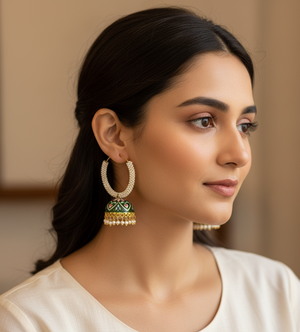 Elegant handpainted green jhumki hoop earrings with the most stunning festoon. The perfect accessory for your occasion. These earrings are handcrafted with love