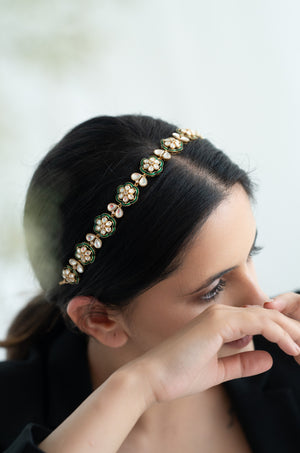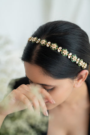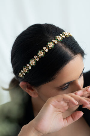 This handcrafted hairband combines intricate Kundan artistry with rich green enamel and clusters of lustrous pearls, creating a timeless and versatile hair accessory. Perfect for brides, bridesmaids, or festive occasions, it adds a regal finishing touch to any outfit. Its lightweight, comfortable fit ensures you can shine all day without compromise.