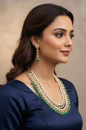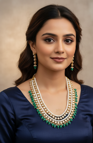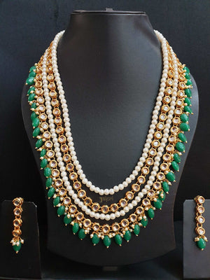 Green Kundan Stone Long Pearl Necklace With Earrings