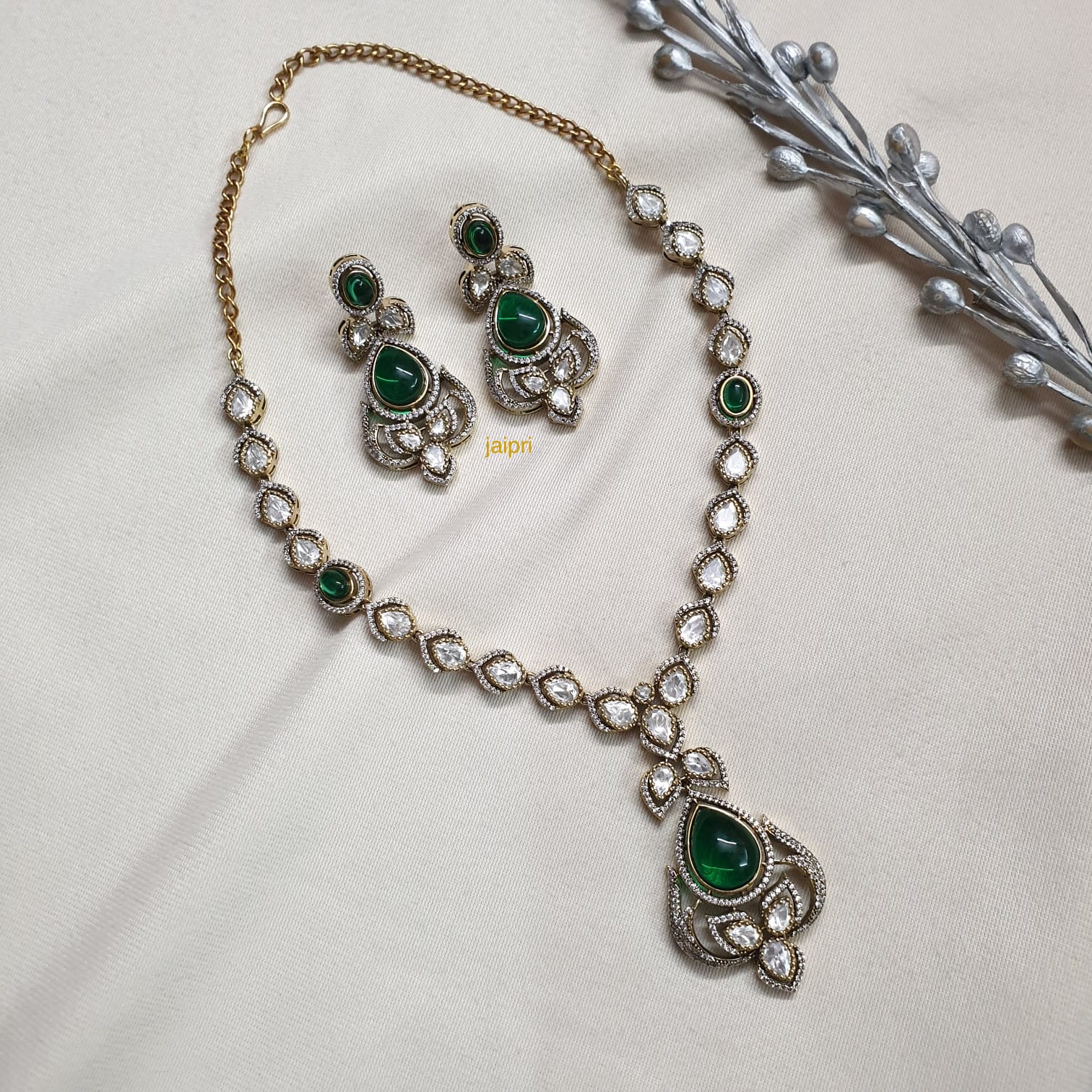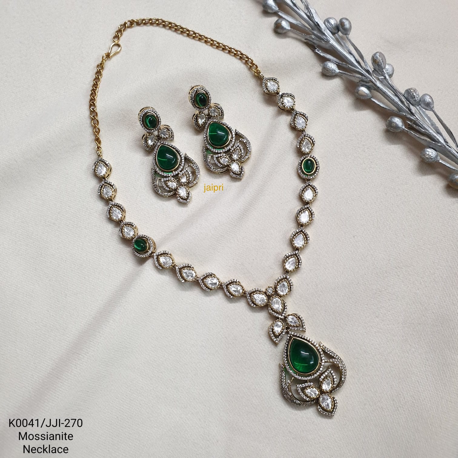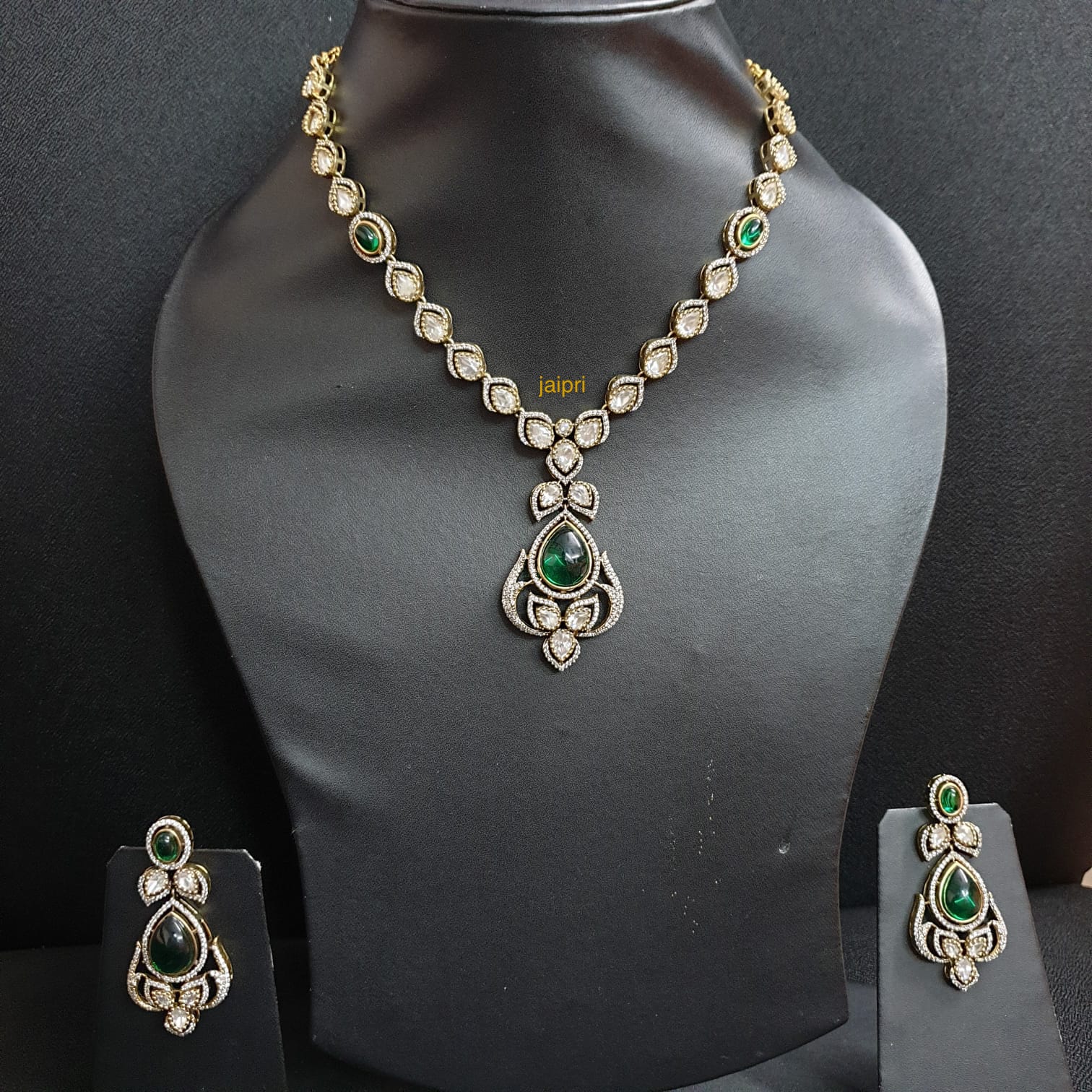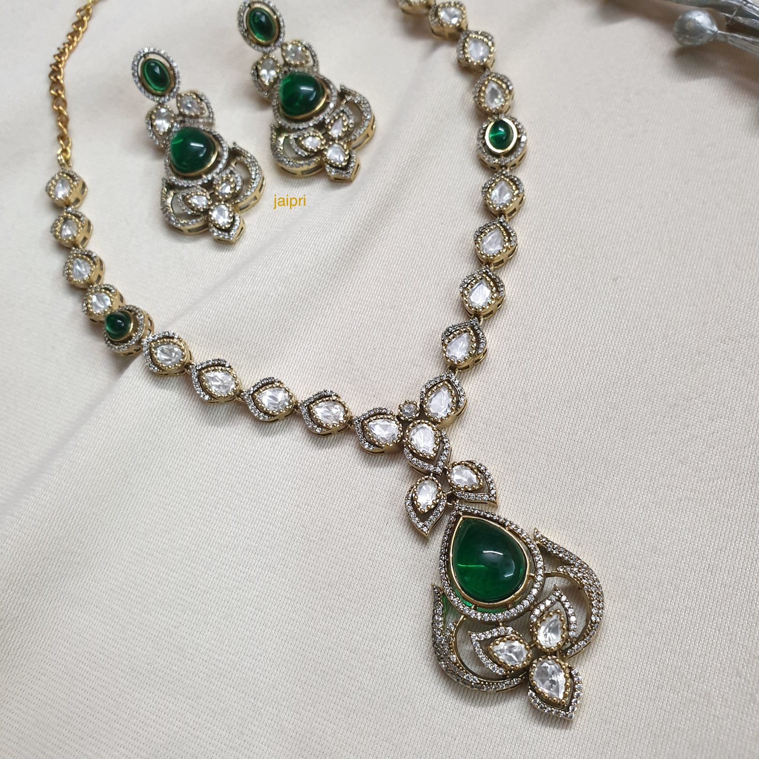 Green Moissanite Kundan Premium Delicate Necklace With Earrings