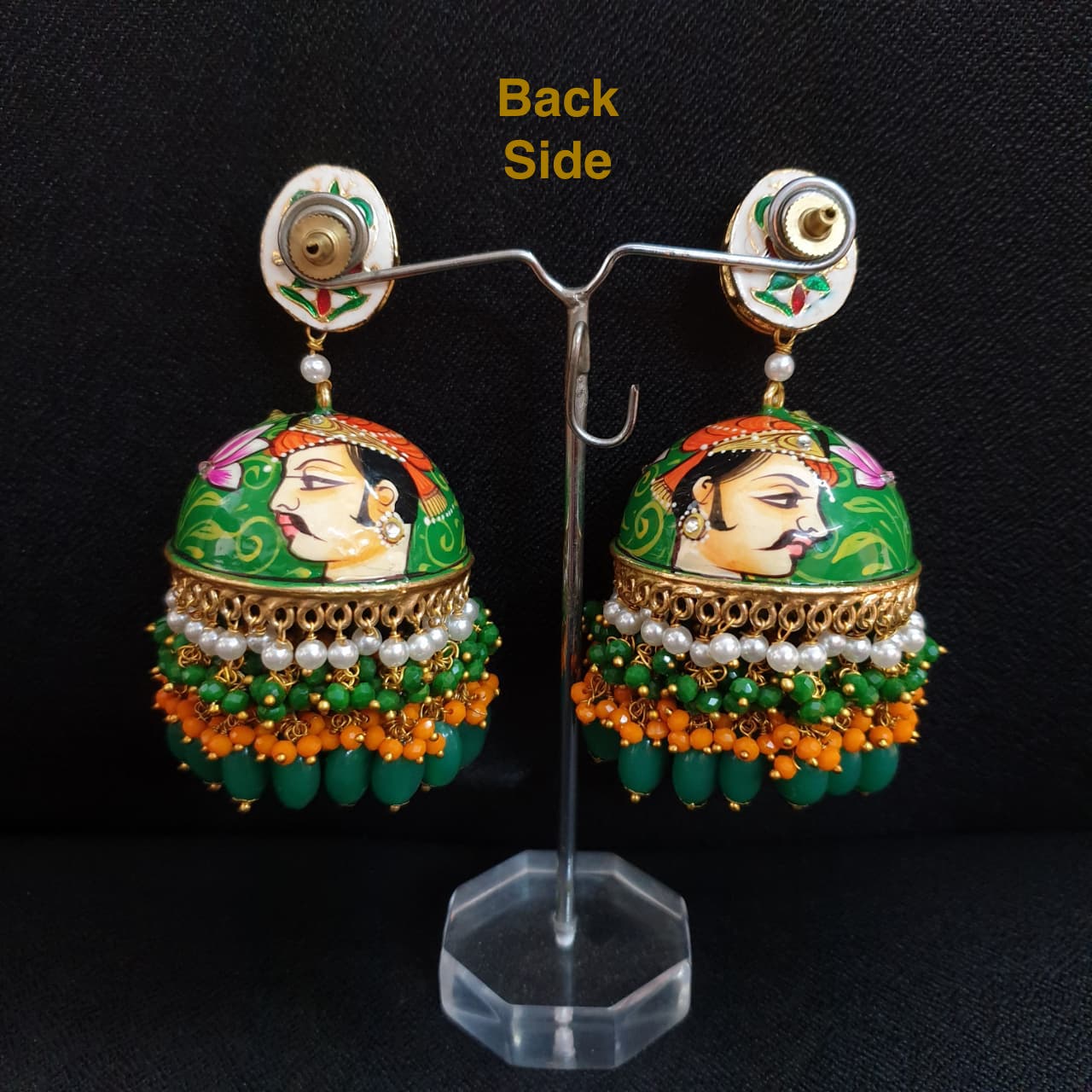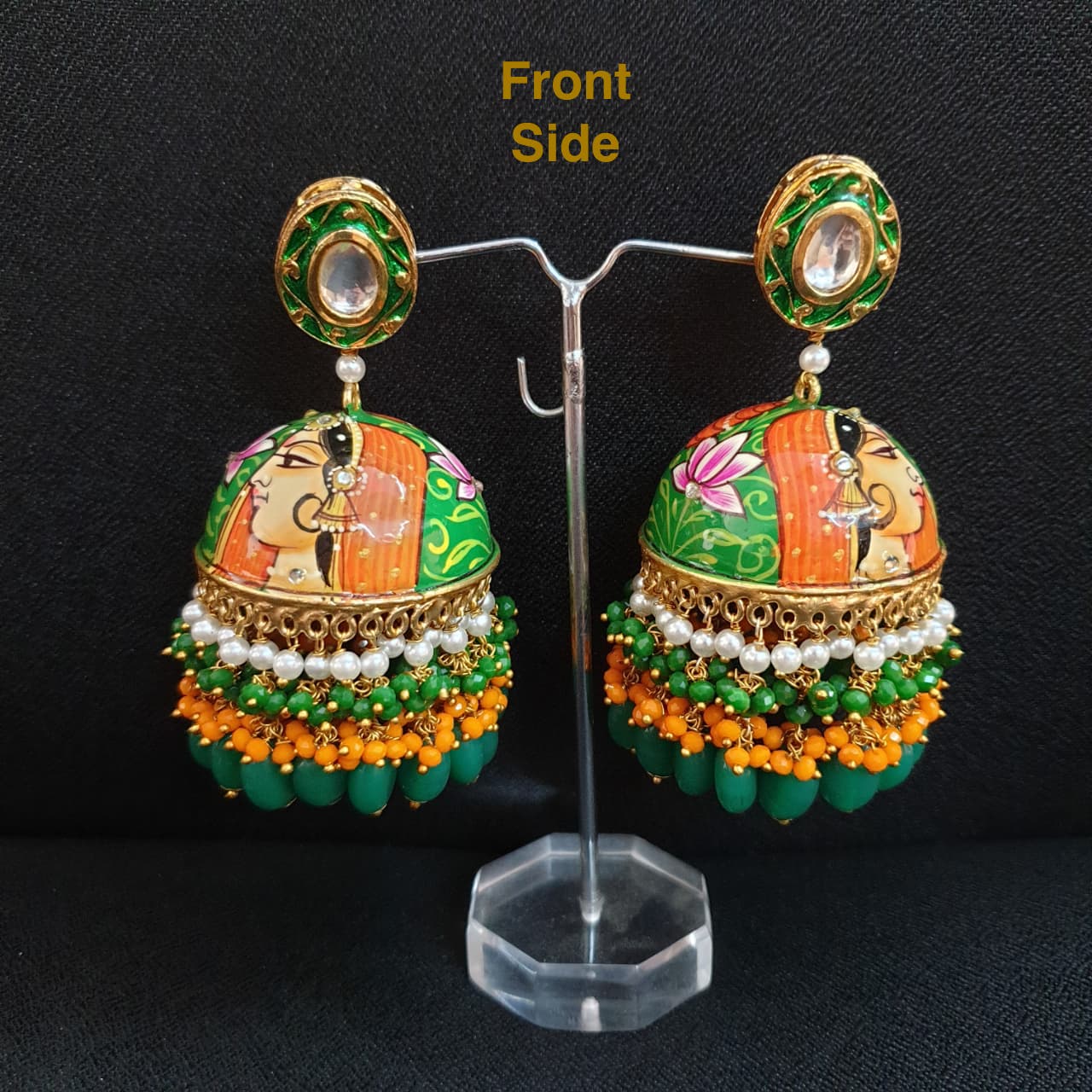 Green Orange Hand Painted Kundan Jhumka Earrings