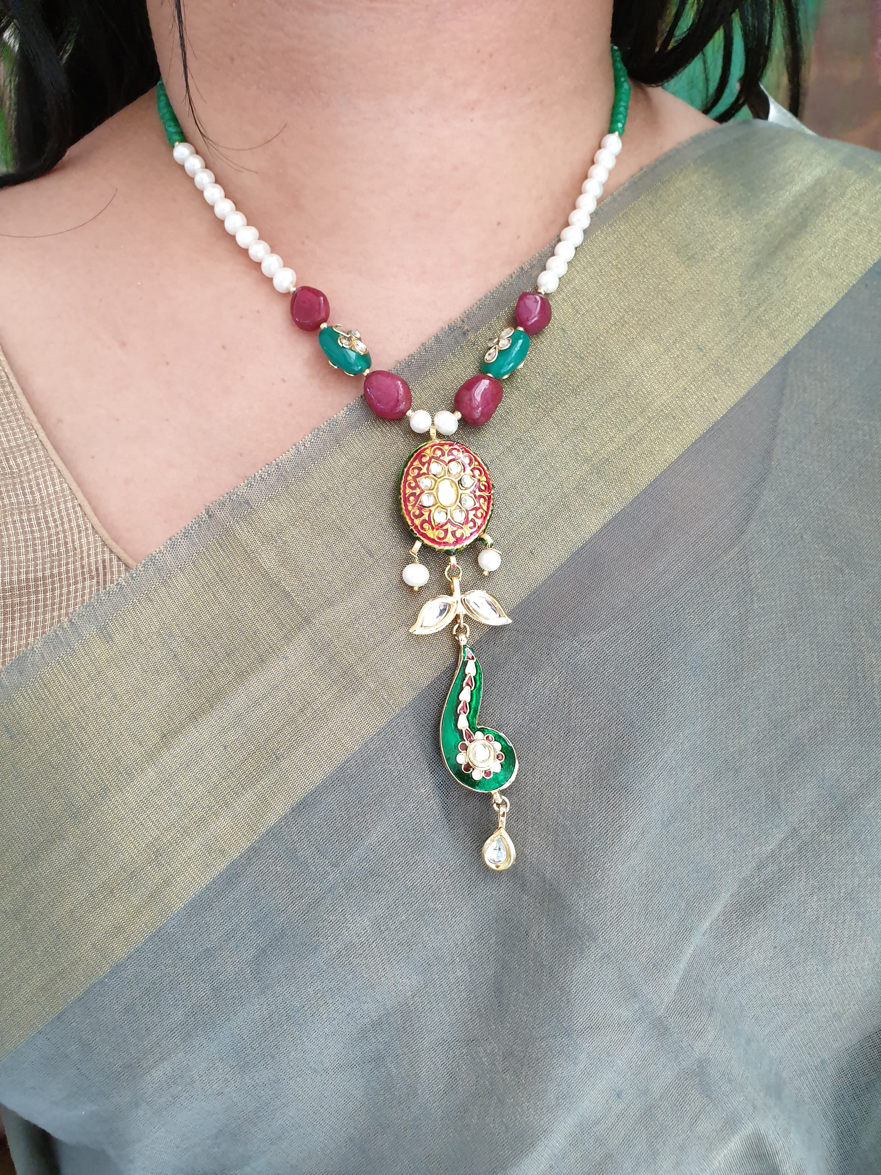 An elegant green & pearl beads stone meenakari stone necklace with the most stunning festoon. The perfect accessory for your occasion. This necklace is handcrafted with love