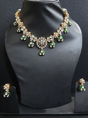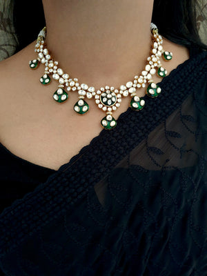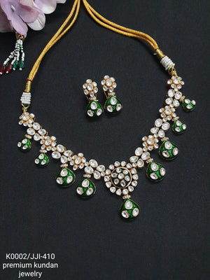 Elevate your style with this exquisite Designer Kundan polki Necklace set. Its intricate craftsmanship and regal charm make it the perfect statement piece