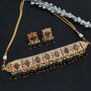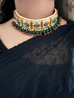 An elegant green beaded red meenakari choker with the most stunning festoon. The perfect accessory for your occasion. This necklace is handcrafted with love