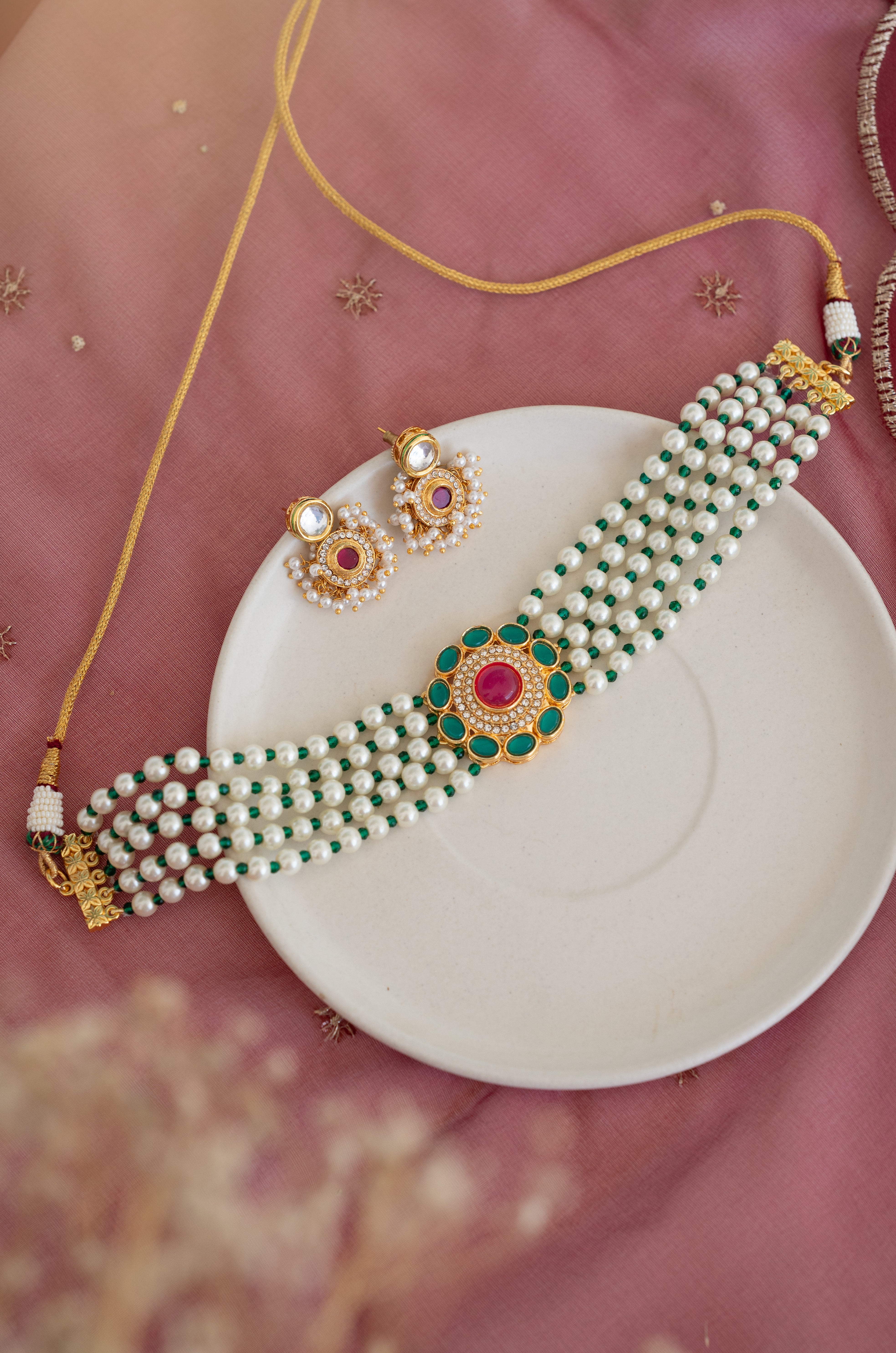 Green Stone Kundan Pearl Beaded Choker Necklace Set