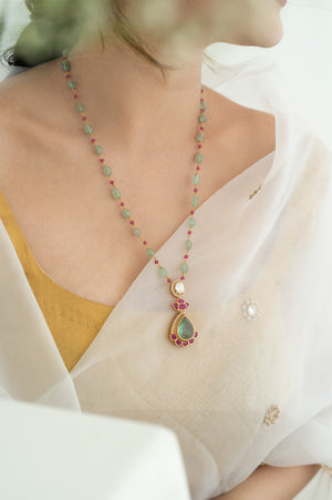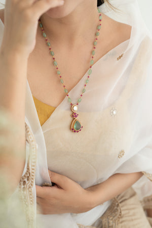 Add timeless elegance to your festive and wedding looks with this green gemstone kundan pendant necklace. Featuring a teardrop green stone pendant set in gold-plated kundan work with ruby accents, this necklace is strung with a green and ruby beaded mala for a regal finish.