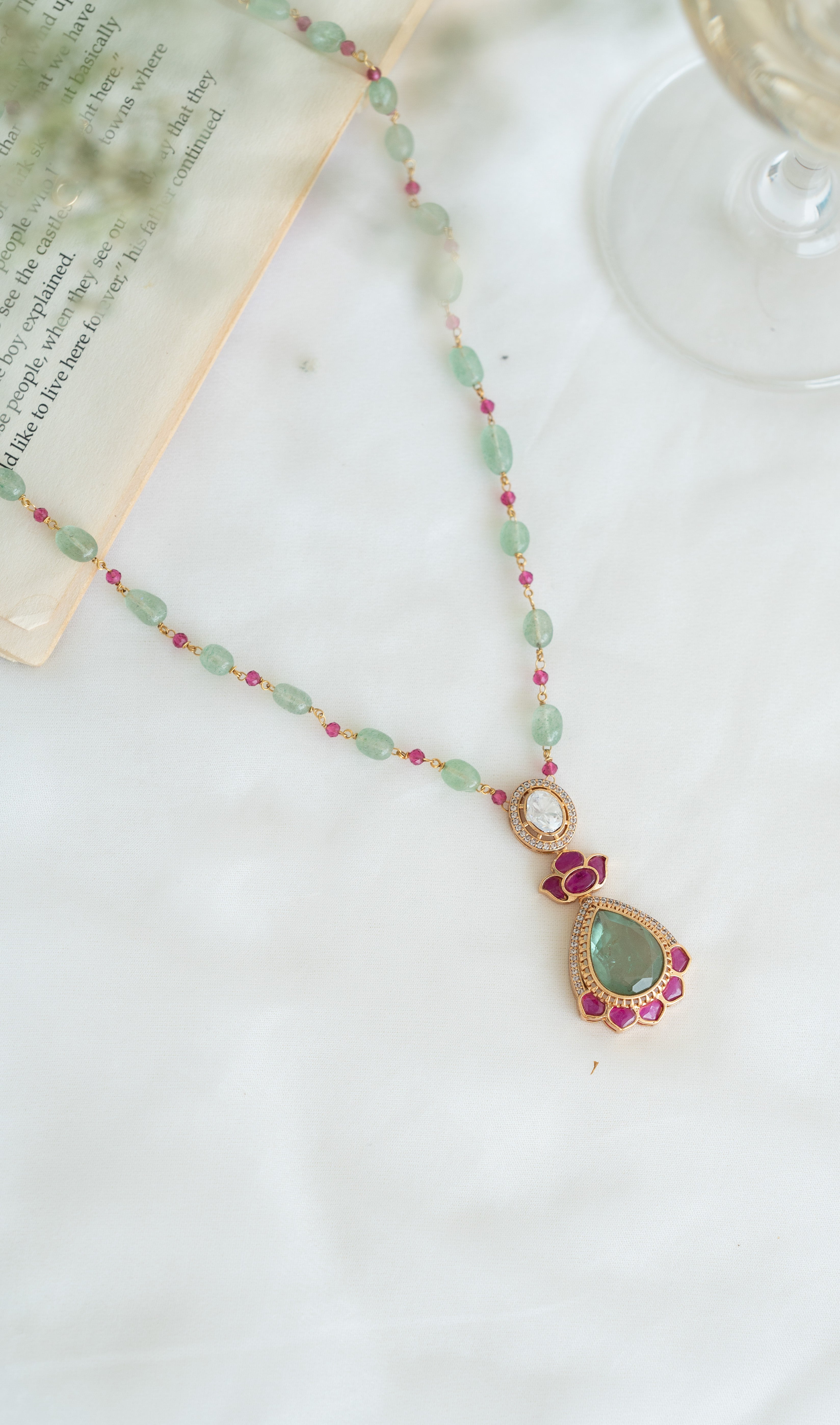 Green Stone Kundan Pendant Necklace with Ruby Beads