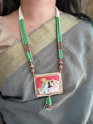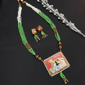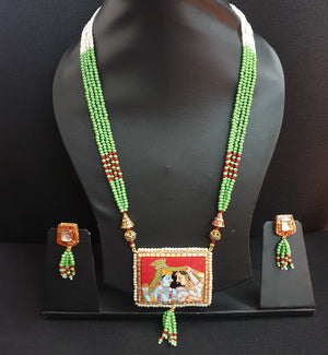 Green Stone Multi Layer Handpainted Radha Krishna Pendant Set