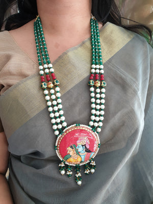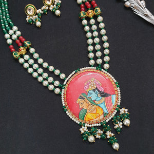 Green Stone Multi Pearl Layer Handpainted Radha Krishna Pendant Set