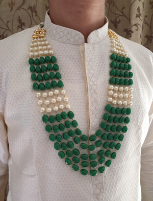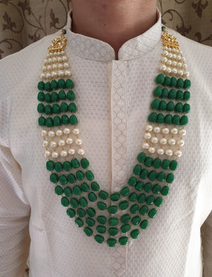 Green Stone With Pearl Long Five Layered Groom Necklace